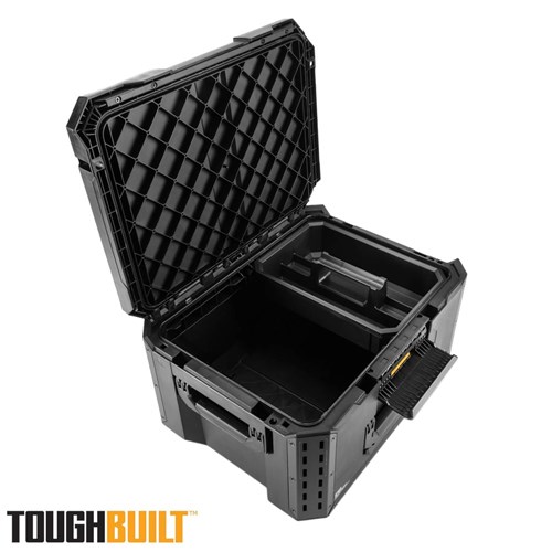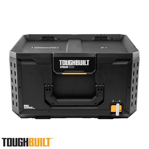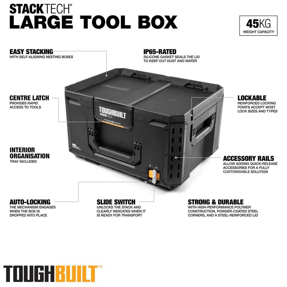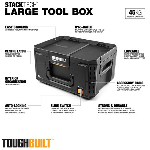 The StackTech Large Tool Box delivers big capacity with the same effortless stacking and rock-solid security the system is known for. Its self-aligning top allows boxes and totes to nest naturally, while the auto-locking interface secures the stack instantly for transport. A clear lock indicator removes any guesswork, giving you confidence your gear is safely locked in. A one-handed centre latch makes tool access fast and intuitive. Inside, an internal tray and divider grooves help Pros organise, separate and customise their space. Tool-free, quick-release steel accessory rails give even more flexibility to build out a personalised setup. Built for harsh jobsite conditions, the large toolbox features armoured corners, a steel-reinforced lid, and an IP65-rated seal to keep out dust and water. Dual locking points ensure your tools stay protected wherever the job takes you.