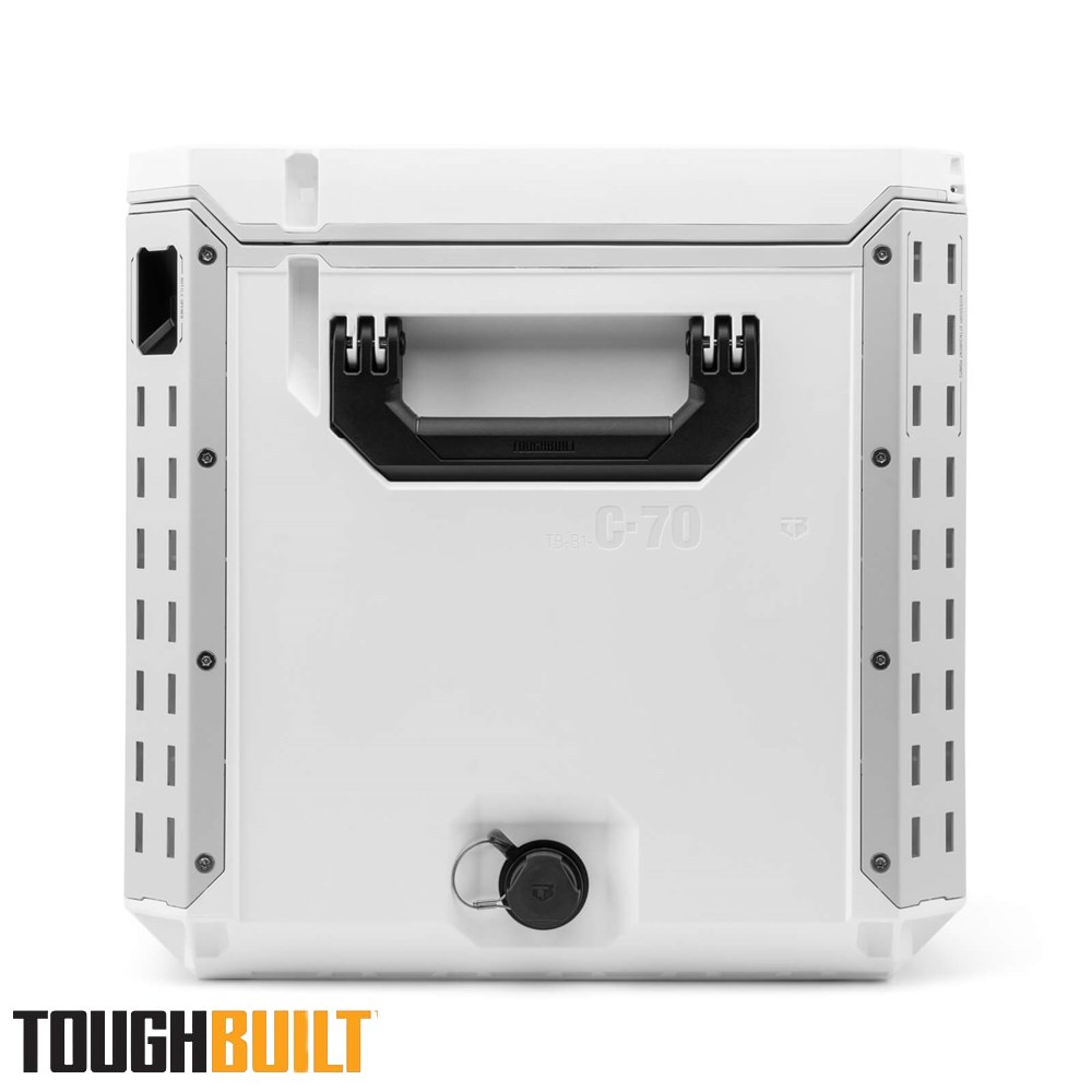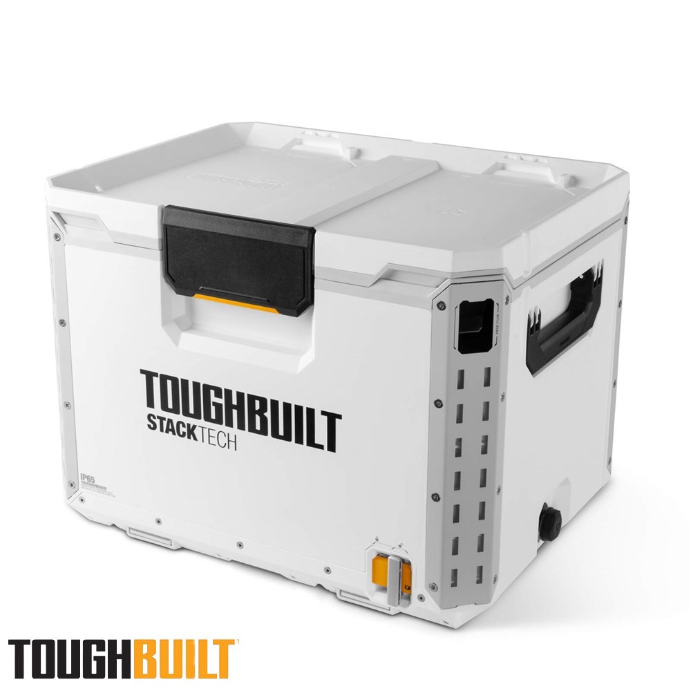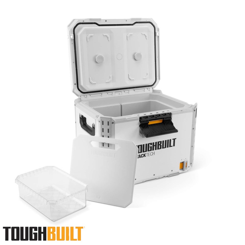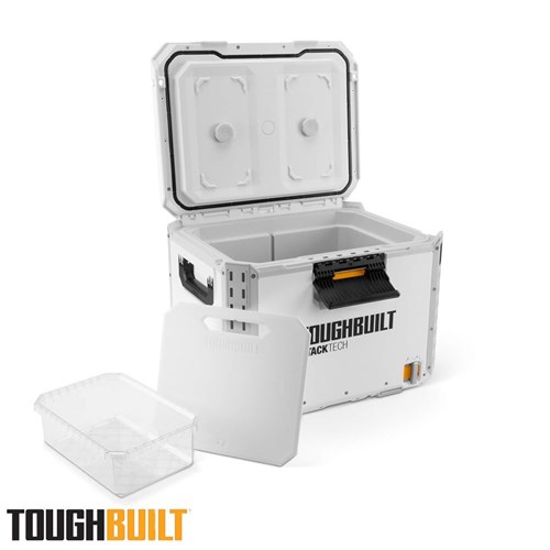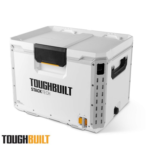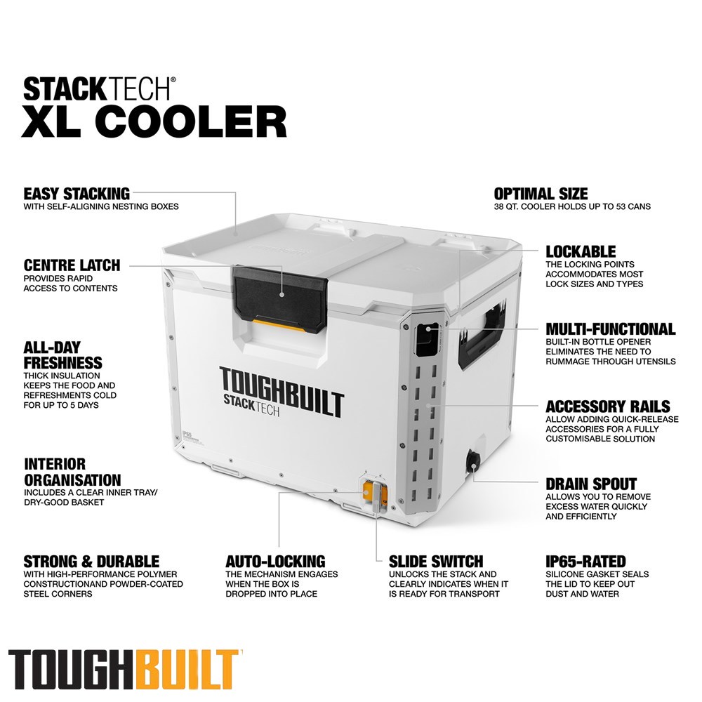 Engineered for performance, durability, and ultimate convenience, the StackTech XL Cooler is your go-to solution for keeping beverages and perishables cold on the toughest jobs. Its self-aligning top allows StackTech boxes and totes to stack effortlessly, while the auto-locking interface and prominent lock indicator ensure a secure and safe transport. Access the cooler easily with a one-handed centre latch and enjoy a 35 L capacity, including a clear tray/dry goods basket and a versatile cutting board that doubles as a divider. Built for rugged conditions, the cooler features armoured corners, a steel-reinforced lid, and IP65-rated dust and water protection. Customisation is simple with tool-free, quick-release steel accessory rails, and a built-in bottle opener and drain spout make refreshment and cleanup hassle-free. Compatible with the ToughBuilt ice pack (TB-B1-A-92, sold separately), this cooler keeps contents fresh for up to 5 days. The lockable lid adds security and peace of mind, making it perfect for work sites, trades, and outdoor adventures.