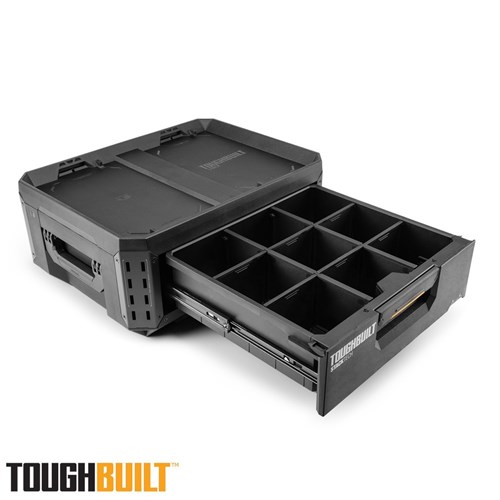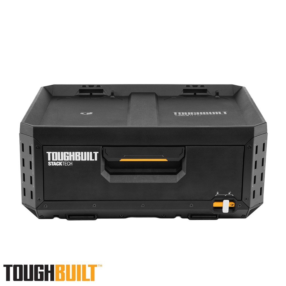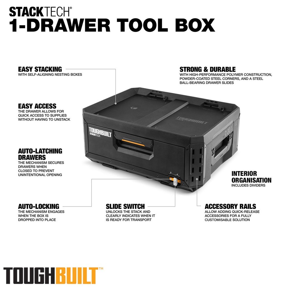The StackTech 1-Drawer Tool Box combines secure stacking with easy access to tools and supplies. Its self-aligning top lets boxes and totes nest effortlessly, while the auto-locking interface ensures each box is locked for transport. A clear lock indicator removes any guesswork, giving confidence that your stack is safe to move. The self-latching drawer provides instant access to contents without unstacking, and eight included dividers (2 large + 6 small) help keep gear organised. Tool-free, quick-release steel accessory rails allow full customisation of your system. Built for tough conditions, the toolbox features armoured corners, high-performance polymer construction, and steel ball-bearing drawer slides for durability and smooth operation.