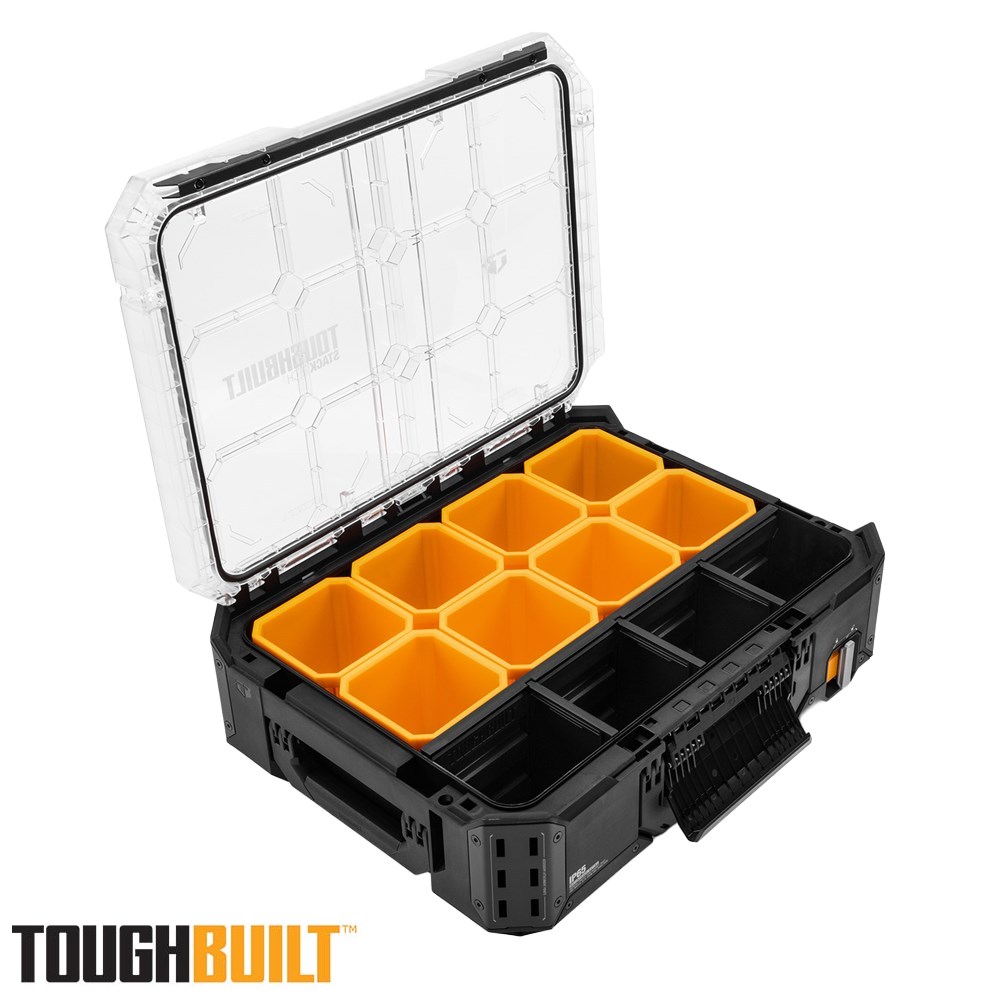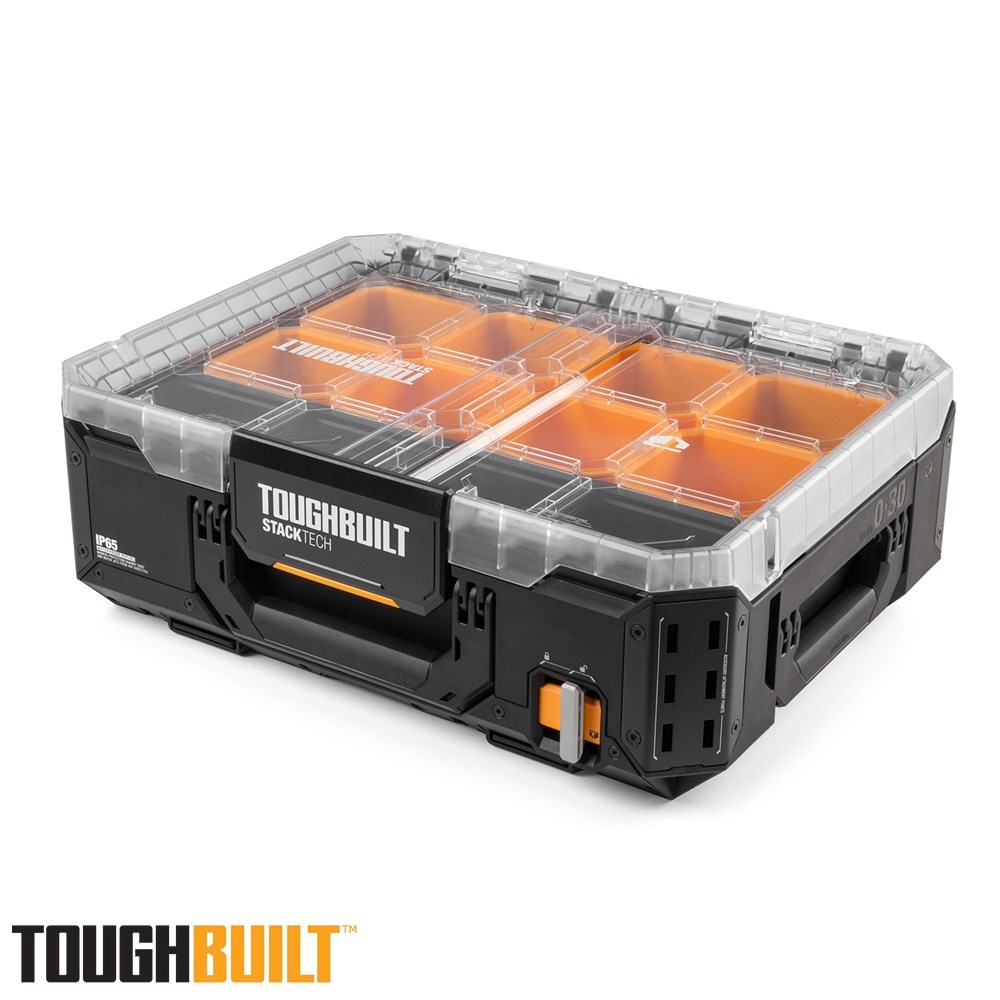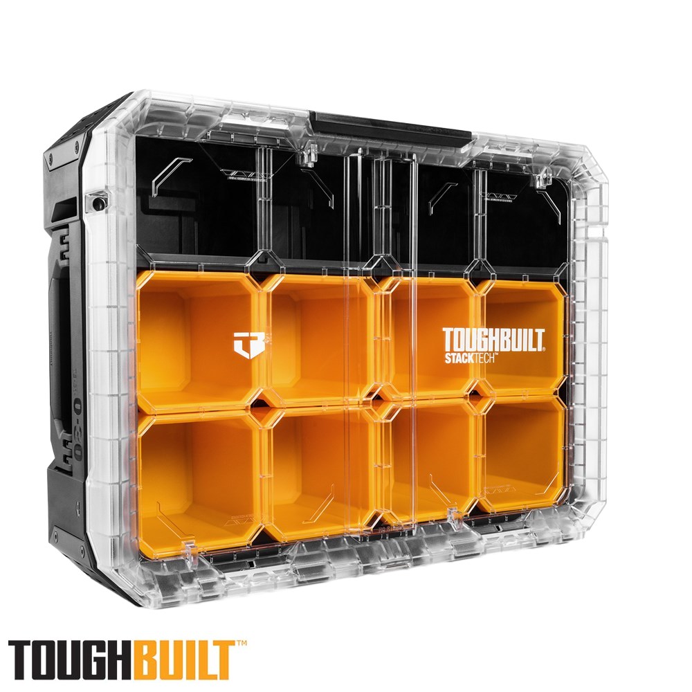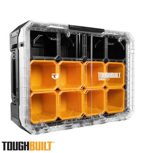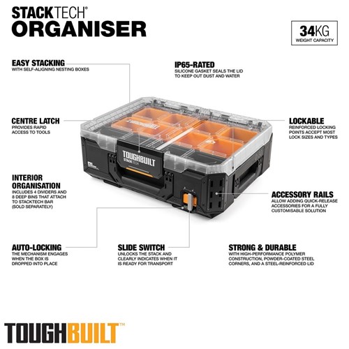 The StackTech Organiser keeps Pros sorted and working efficiently. Its self-aligning see-through top allows easy stacking with other StackTech boxes, while the auto-locking interface ensures each unit locks securely for transport. A clear lock indicator removes any guesswork, and the one-handed centre latch provides fast, intuitive access. Inside, eight deep bins and four dividers offer ample space to organise and partition tools, fasteners, and small parts. Built for durability, the organiser features high-performance polymer construction, armoured corners, a steel-reinforced lid, and IP65 dust and water protection. Tool-free, quick-release accessory rails allow full customisation, and dual locking points keep your gear secure on and off the jobsite.