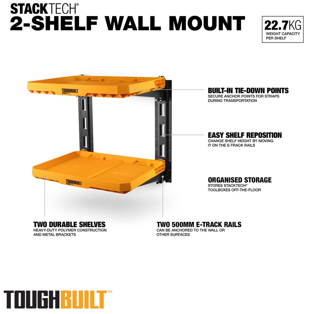 The StackTech 2-Shelf System provides a versatile and sturdy solution for organising StackTech toolboxes in workshops, vans, or trailers. Featuring two heavy-duty shelves supported by robust metal brackets and two 20" standard e-track rails, the system allows shelves to be securely anchored and easily repositioned along the rails for customised storage. Each shelf includes built-in tie-down points for safe transport and can hold up to 22 kg, keeping your tools off the floor and your workspace efficient.