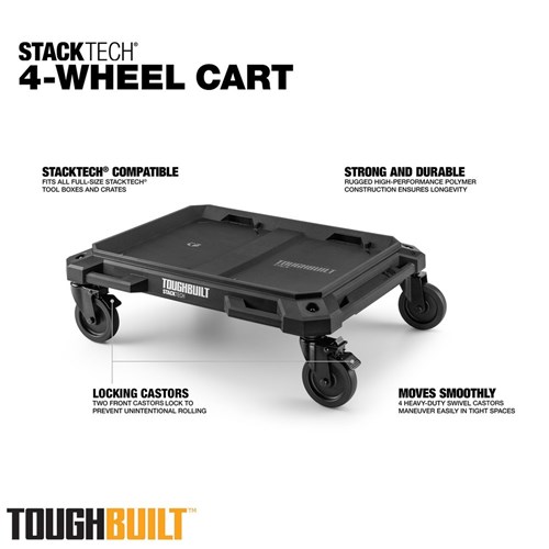 The StackTech 4-Wheel Cart provides a convenient solution for transporting StackTech toolboxes and organisers with ease. Designed specifically for the StackTech system, boxes automatically lock into place when stacked on the cart. Four heavy-duty 3.9" swivel castors allow smooth manoeuvring through tight spaces, while the two front castors feature locks to keep the cart stationary during loading, unloading, or when parked. Built from durable high-performance polymer, the cart withstands daily use in demanding environments. Built-in tie-down points provide additional security, making it easy to move your tools and workstations safely from one job to the next.