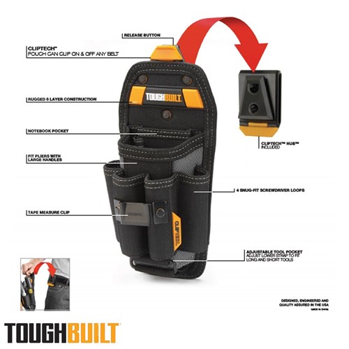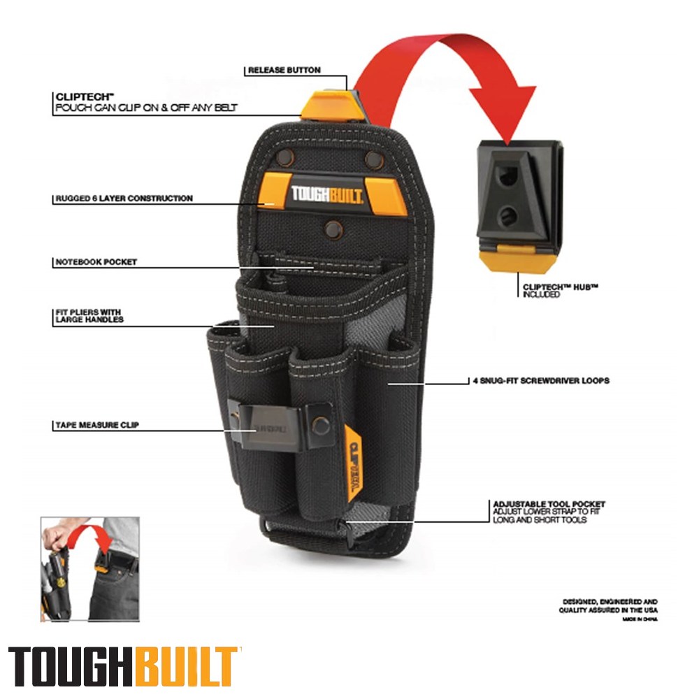 The ToughBuilt® Large Technician 6-Pocket Pouch keeps your tools organised and accessible on the job. Featuring the patented ClipTech™ Hub™, it easily clips on and off any belt, including ClipTech™ tool belts, or can be used standalone. Its unique adjustable main pocket securely holds pliers or accommodates longer tools, while 4 snug-fit screwdriver loops, a notebook pocket, pencil pocket, and tape measure clip ensure everything has its place. Rugged 6-layer construction with heavy-duty rivet reinforcement provides durability you can rely on in even the toughest working conditions.