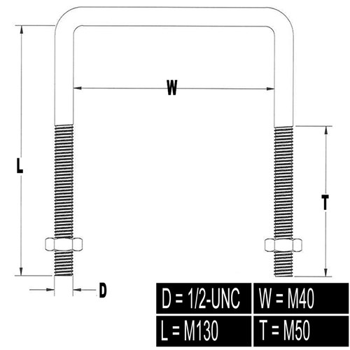 2 X U-BOLTS ZINC PLATED & NUTS D=1/2 BSW W=M40 L=M130 T=M50