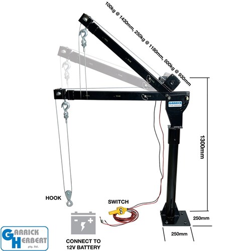 The Garrick Herbert 12V Ute Crane is a lightweight, compact, and portable lifting solution designed for utes, service bodies, vans, trucks, loading docks, and platforms. With a powerful 12V DC winch, it effortlessly lifts up to 500kg with a single line lift or 800kg with a double line setup.