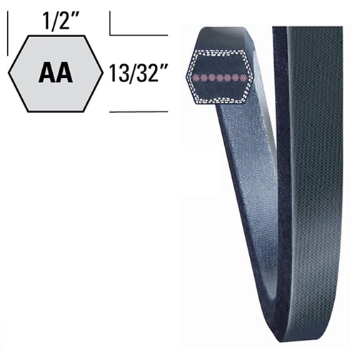 Hexagonal double V-Belts are ideally suited for serpentine drives where power needs to be transmitted equally from both sides of the belt. Heavy duty cover is impregnated with oil and heat resistant rubber. The centrally located cord and special synthetic rubber compounds assure long belt life and capable horsepower capacity.