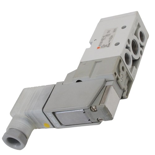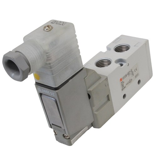 SMC® VF3133K-6DZ1-02 designed to control pneumatic actuators. Configured to extend and retract cylinders and is set up as a 5 port x 2 position. It utilizes a smaller internal pilot valve to operate the larger main valve, allowing for high-pressure control with lower power consumption.