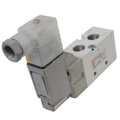 SMC® VF3133K-7DZ1-02 designed to control pneumatic actuators. Configured to extend and retract cylinders and is set up as a 5 port x 2 position. It utilizes a smaller internal pilot valve to operate the larger main valve, allowing for high-pressure control with lower power consumption.