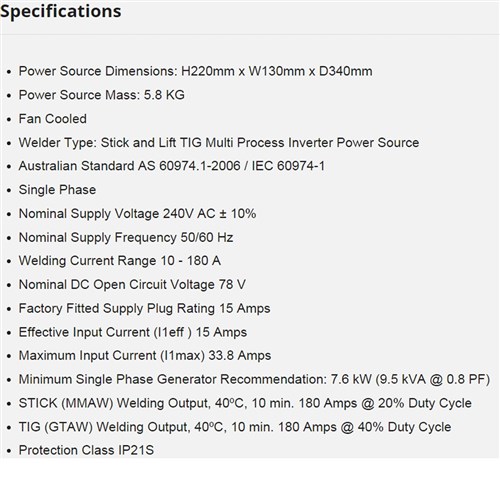 - Duty Cycle: Stick (MMAW): 20% @ 180amps (40C, 10 mins) TIG (GTAW): 40% @ 180amps (40C, 10 mins)