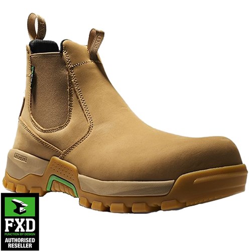 The FXD WB4 NITROLITE™ Slip On Work Boot delivers high performance with all-day comfort. Featuring NITROLITE™ midsole technology, these double-bound elastic sided boots provide superior cushioning and support. Built to meet Australia and New Zealand safety standards, they are equipped with a lightweight composite safety toe and a slip, oil, and heat-resistant rubber outsole. The Nubuck, microfiber, and TPU upper material ensures durability, while a Poron midsole insert adds extra heel cushioning. Designed for tough environments, they also feature reinforced stitching, a protective heel kick panel, and a ventilated, antimicrobial footbed for enhanced comfort and breathability.