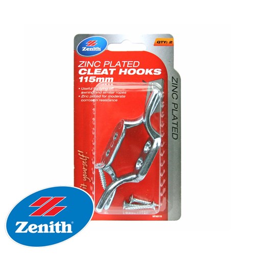 Pre-packaged zinc plated cleat hooks.