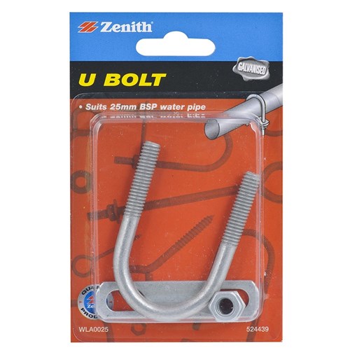 Pre-packaged galvanised ubolt with fixing plate and nuts.