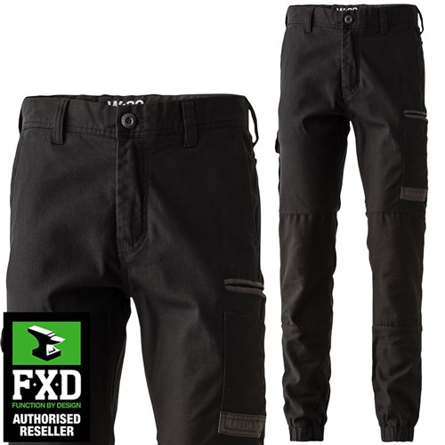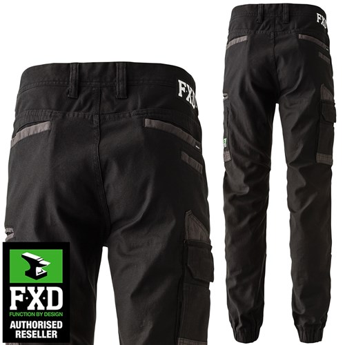 FXD Mens WP4 Work Pant. These pants features Dura500 reinforced pockets and attachment loop, elastic cuffed, 360 degree stretch reversed peach twill, double layer internal pocket bags, YKK zip full fly and triple needle seams. Made from 8.8oz 295gsm Formatik Cotton. Formatik 360 Degree Stretch cotton enables all direction movement and allows for articulated garment design and construction.