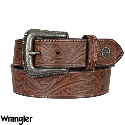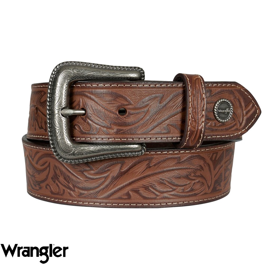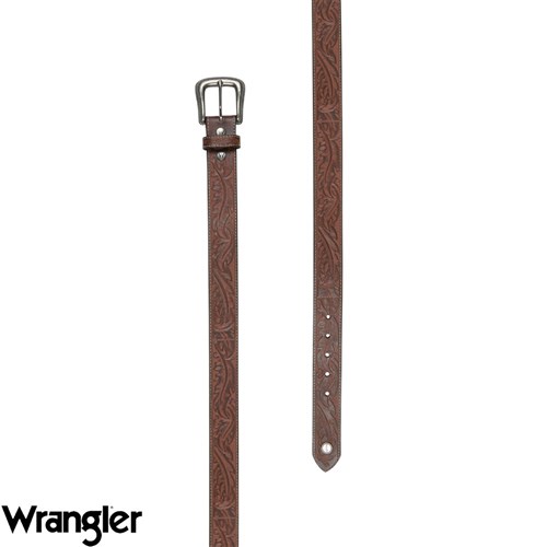 Add a touch of classic western style with the Wrangler Elle Tan Belt. Crafted from genuine leather, it features a tooled feather design, removable buckle, and the iconic Wrangler® concho with antique silver hardware. A versatile accessory that pairs perfectly with both casual and dressed-up looks.