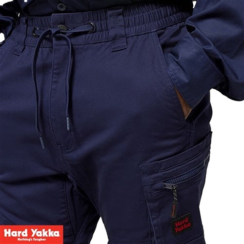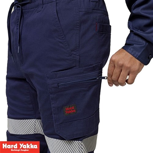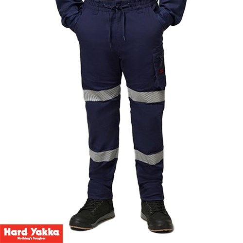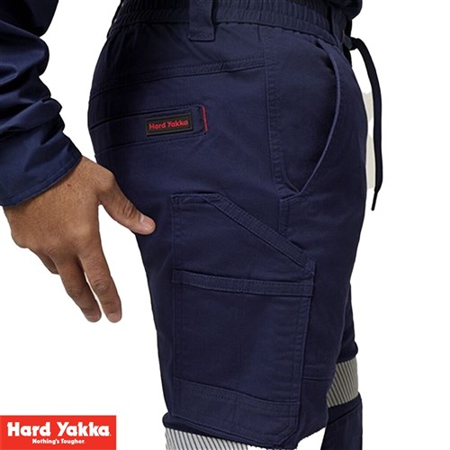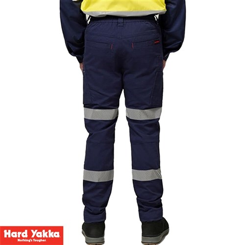 The 3056 Tough Maxx Taped Work Pants are built to handle tough work environments while keeping you comfortable and protected. Crafted from soft cotton-rich fabric, these pants offer a regular fit with a stretch design and enzyme wash for extra durability and comfort. The elasticated waistband with belt loops and drawstring fastening ensures a snug fit, while the zip front closure adds practicality. Featuring a crotch gusset with twin-needle stitching for increased mobility, these pants also include double-layered canvas knee panels for added strength. The pants are equipped with side utility cargo pockets, back welt pockets, and a tradie ruler pocket for secure, on-the-go storage. With segmented double-hooped reflective tape and a UPF 50+ rating, they provide excellent visibility and sun protection.